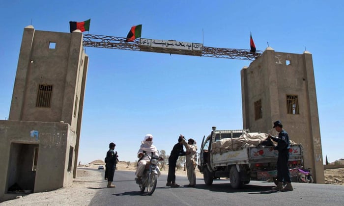 Members of the Afghan security services man a checkpoint on a roadside in the Gereshk district of Helmand province. Photograph: Watan Yar/EPA