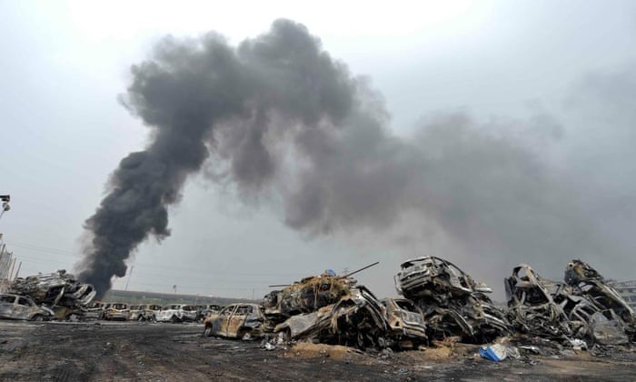 Fires continue to burn at the site of the original explosions in Tianjin. Photograph: Yue Yuewei/Xinhua Press/Corbis