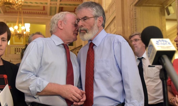 Sinn Féin’s Martin McGuinness and Gerry Adams confer before speaking to the press on Thursday. Photograph: Charles McQuillan/Getty Images