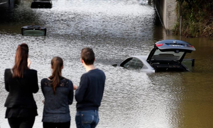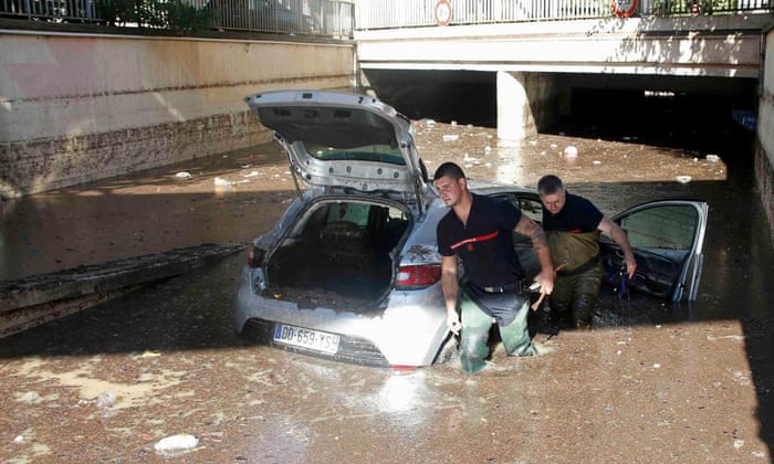 French fireman inspect an abandoned car stuck in muddy waters near an underpass in Cannes. Photograph: Eric Gaillard/Reuters