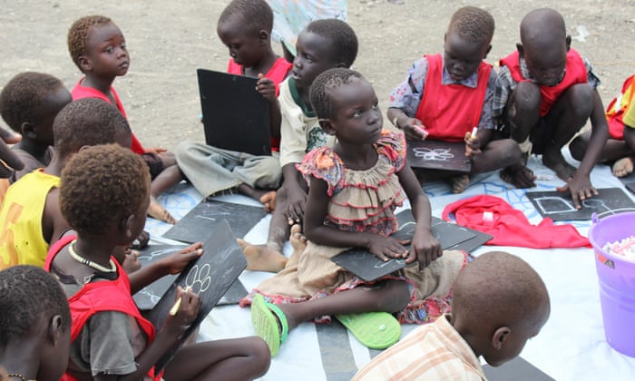 In the schoolyard at the Malakal protection of civilians camp children sketch on slates with chalk. Photograph: Unicef