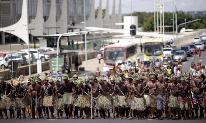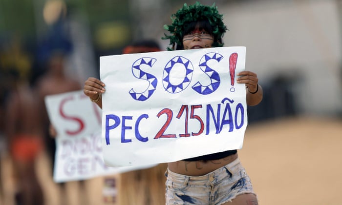A indigenous woman protests during the first World Games for Indigenous Peoples. The sign says: ‘SOS! No to the proposed constitutional amendment 215 (PEC 215).’ Photograph: Ueslei Marcelino/Reuters