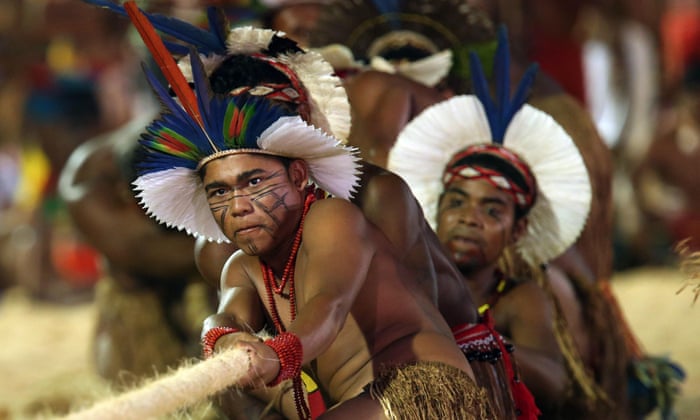 Pataxo Indians from Brazil pull on the rope during the tug of war competition at the World Indigenous Games, in Palmas, Brazil. Photograph: Eraldo Peres/AP