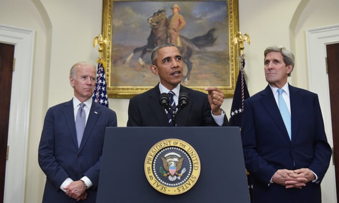 Barack Obama announces his rejection of the Keystone XL pipeline, flanked by secretary of state John Kerry, and vice-president Joe Biden. Photograph: Mandel Ngan/AFP/Getty Images