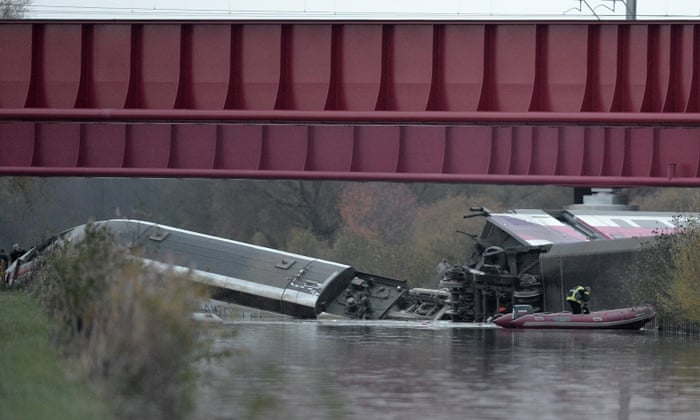Pictures from a Reuters photographer showed the locomotive partly submerged in a canal alongside the tracks with train parts lying broken and detached in a field. Medical units, including police divers, attended the scene.