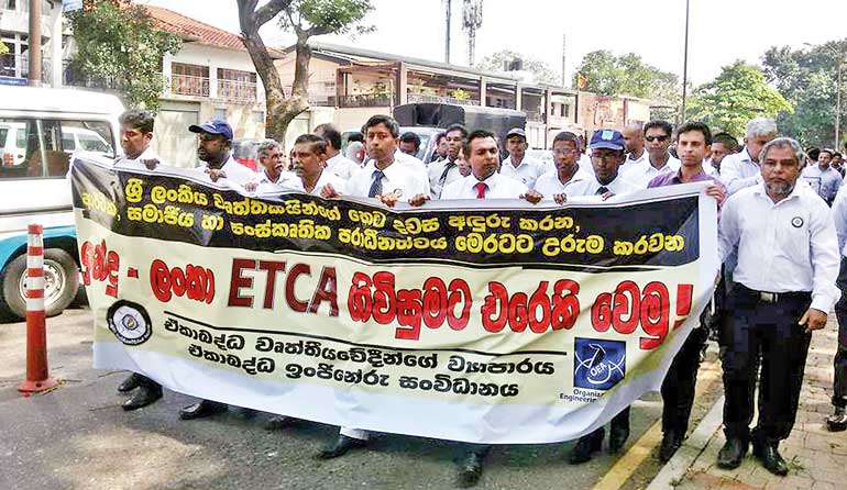 with-growing-opposition-to-ETCA ), it was pointed out that the secrecy surrounding the proposed Economic and Technology Cooperation Agreement, now commonly known as ETCA, had left both supporters and opponents in a state of confusion. As a result, fear has engulfed the local professional bodies of every description that Indian professionals would flood Sri Lanka’s limited job markets. Such a flooding, it has been argued by protesting professionals, would not only displace those currently employed in respective professions but also deny opportunities to those waiting to join them in the future.