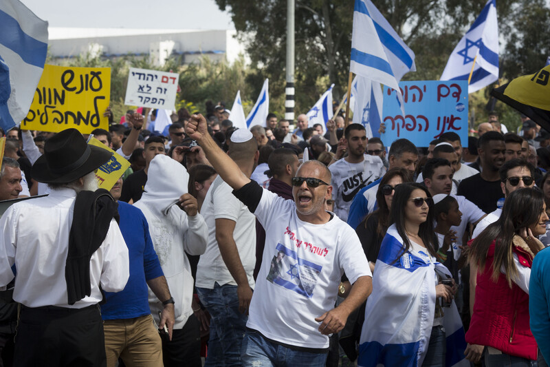 Israelis rally outside an Israeli military court in Kiryat Malakhi in support of an Israeli soldier shown on video shooting an incapacitated Palestinian in the head, 29 March.-ActiveStills
