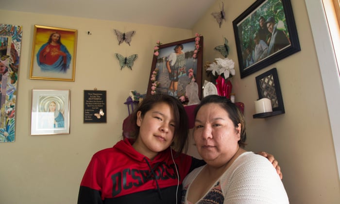 Stephanie Hookimaw, right, and her niece Karrisa Koostachin pose next to memorial photos of her daughter, Sheridan Hookimaw, who committed suicide in October. Photograph: Laurence Mathieu for the Guardian