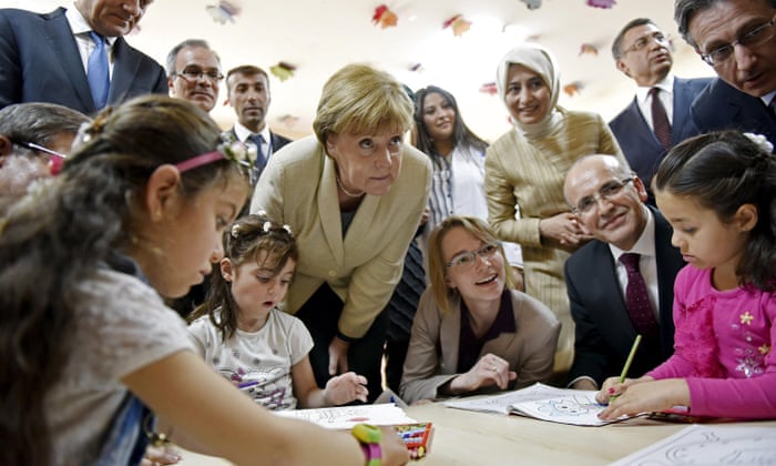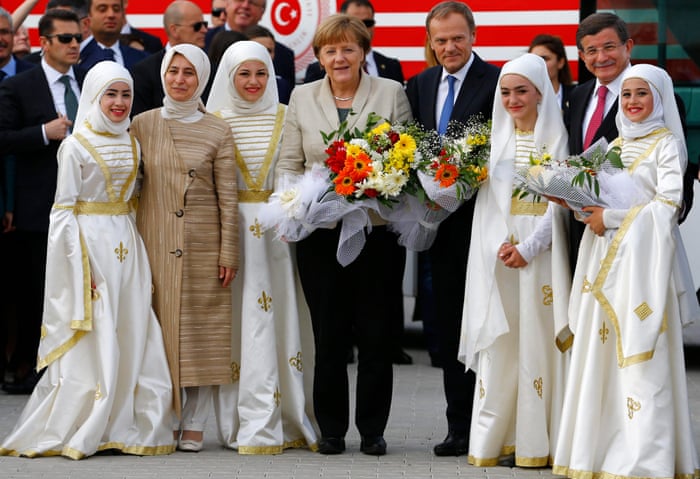 Saturday’s photocall was the latest in a series of moves aimed at encouraging Turkey to help to end the continent’s greatest wave of human movement since the second world war. More than 850,000 migrants entered Europe after leaving Turkey last year, most of them ending up in Germany, and Merkel wants Turkey’s support to bring the numbers down. In exchange, Europe has also promised looser visa restrictions for Turks travelling to Europe, and has agreed to accelerate negotiations over Turkey’s proposed accession to the EU.
