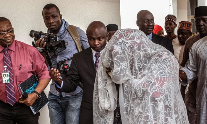 On Thursday she was flown to Abuja in the presidential jet to meet Buhari. In a press conference at the presidential villa while waiting for the president to arrive, Nkeki first hid her face from the cameras, then greeted Buhari and handed him her four-month-old baby girl, born in captivity.