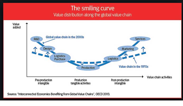 The comparison of the previous case with the modern model with respect to the value addition at each stage has given rise to the famous Smile Curve, invented by Stan Shih, the founder of ACER computers (available at http://www.uniba.it/ricerca/dipartimenti/dse/e.g.i/egi2014-papers/ito).