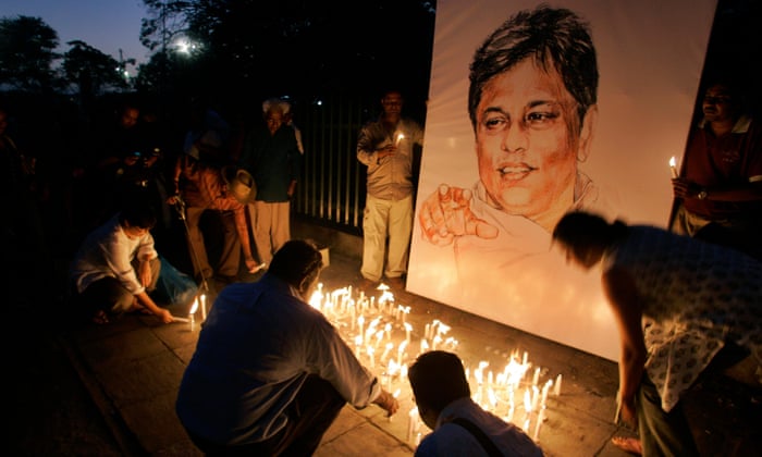 Activists and members of Sri Lankan civil societies light candles in front of a portrait of Sunday Leader newspaper editor Lasantha Wickrematunge in a silent vigil condemning his killing in Colombo. Photograph: Gemunu Amarasinghe/AP