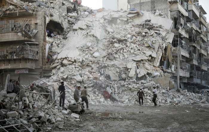 Members of the Syrian Civil Defence, known as the White Helmets, search for victims following airstrikes in Aleppo by Russian and Syrian warplanes. Photograph: Karam Al-Masri/AFP/Getty Images