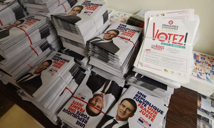 Campaign pamphlets supporting Manuel Valls, the former French prime minister, are stacked before distribution. Photograph: AFP/Getty