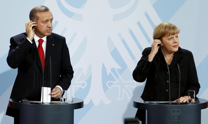 Recep Tayyip Erdoğan and Angela Merkel in 2012. The Turkish president has increasingly cracked down on press freedom. Photograph: Michael Sohn/AP
