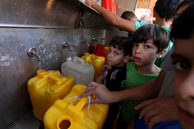 Palestinian children fill containers with water at a public tap in Jabaliya, northern Gaza, July 2014. APA images