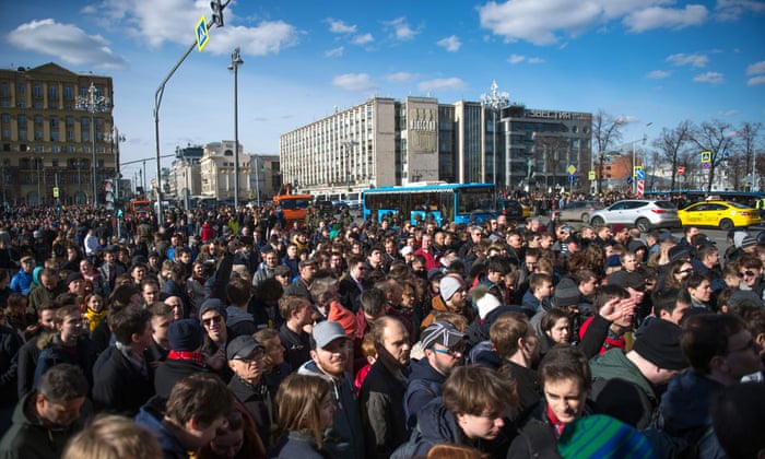 Sunday’s protests were subjected to a blackout on state media, which acted as if they were not taking place. However, in a worrying sign for the Kremlin, even in dozens of smaller cities across the country several hundred people came to protest. In Vladivostok in the far east of the country, police detained a number of protesters, while in St Petersburg, several thousand gathered on Palace Square, just a fortnight after the centenary of the revolution that deposed the last tsar in 1917.