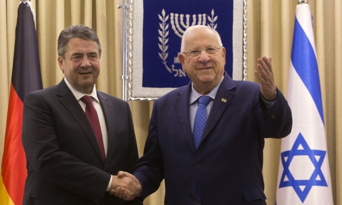 German foreign minister Sigmar Gabriel (left) with Israel’s president, Reuven Rivlin, in Jerusalem on Tuesday. Photograph: Sebastian Scheiner/AP