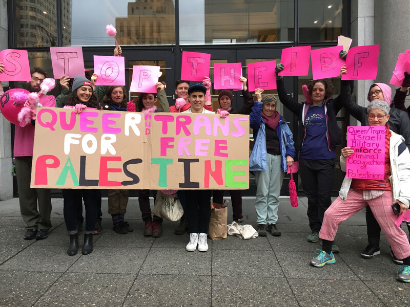Queer and transgender activists protested an event featuring an Israeli soldier in Seattle on 5 April.