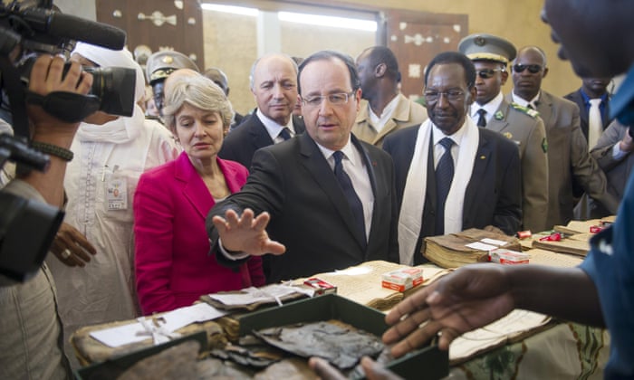 President Hollande in Mali in February 2013. Photograph: Fred Dufour/AFP/Getty Images--A restoration expert with one of the manuscripts in 2016. Photograph: Thomas Imo/Photothek via Getty Images--