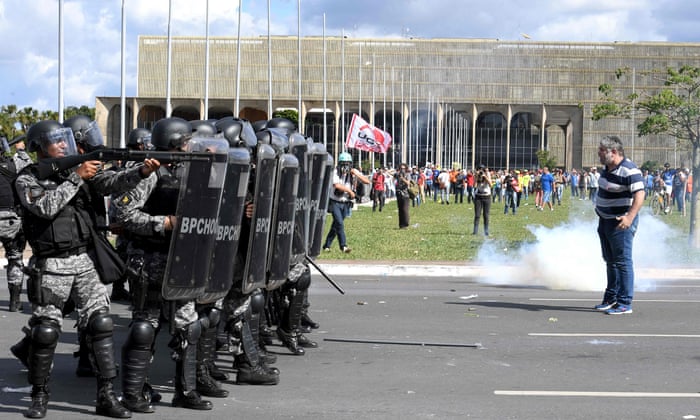 A protester stands in front of a line of riot police in Brasilia on Wednesday. Photograph: Evaristo Sa/AFP/Getty Images