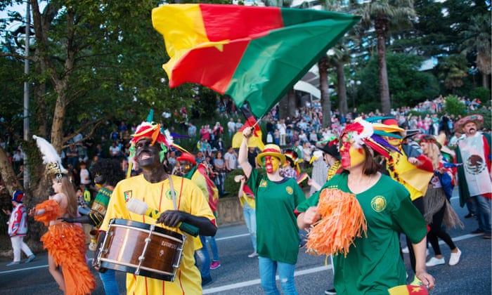 A photograph from state news agency Tass showed a man in a Cameroon jersey with his face and arms painted black beating a drum at the Carnaval Sochi Fest parade on Saturday. A second man in blackface is visible behind him, wearing an Afro wig and carrying a drum and bananas on a string.