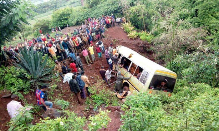 People gather at the scene of a bus crash on the Arusha-Karatu highway in Tanzania. Photograph: Stringer/Reuters