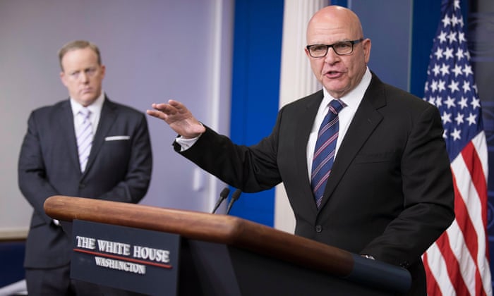 The national security adviser, HR McMaster, takes questions from the press, as Sean Spicer looks on. McMaster said the real threat came from leaks to the press. Photograph: Shawn Thew/EPA