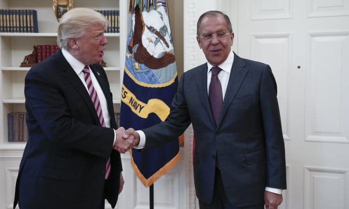 Trump with the Russian foreign minister, Sergei Lavrov, in the Oval Office last week. Trump’s Tuesday tweets contradicted flat denials issued by senior officials on Monday night. Photograph: Tass/Barcroft