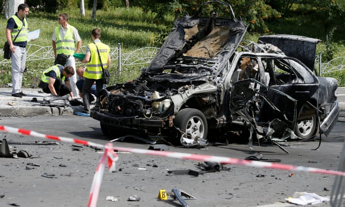 Investigators in Kiev analyse the wreckage of the car bombing that killed Maksim Shapoval, a high-ranking military intelligence official. Photograph: Valentyn Ogirenko/Reuters