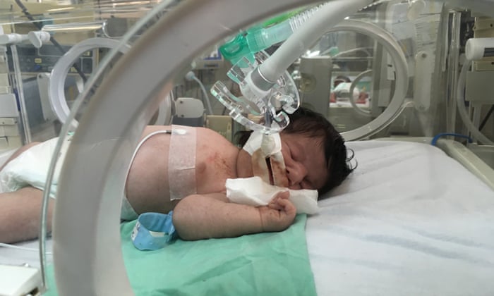 A baby born with congenital heart disease in Shifa hospital’s neonatal unit. Photograph: Sarah Helm for the Observer