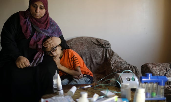 Mohammad Shanty, who suffers from cystic fibrosis, sits next to his mother after receiving oxygen therapy during a power cut in their family house. Photograph: Mohammed Salem/Reuters