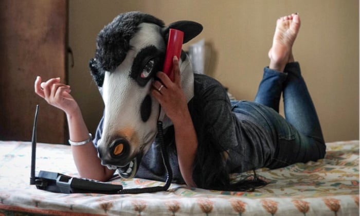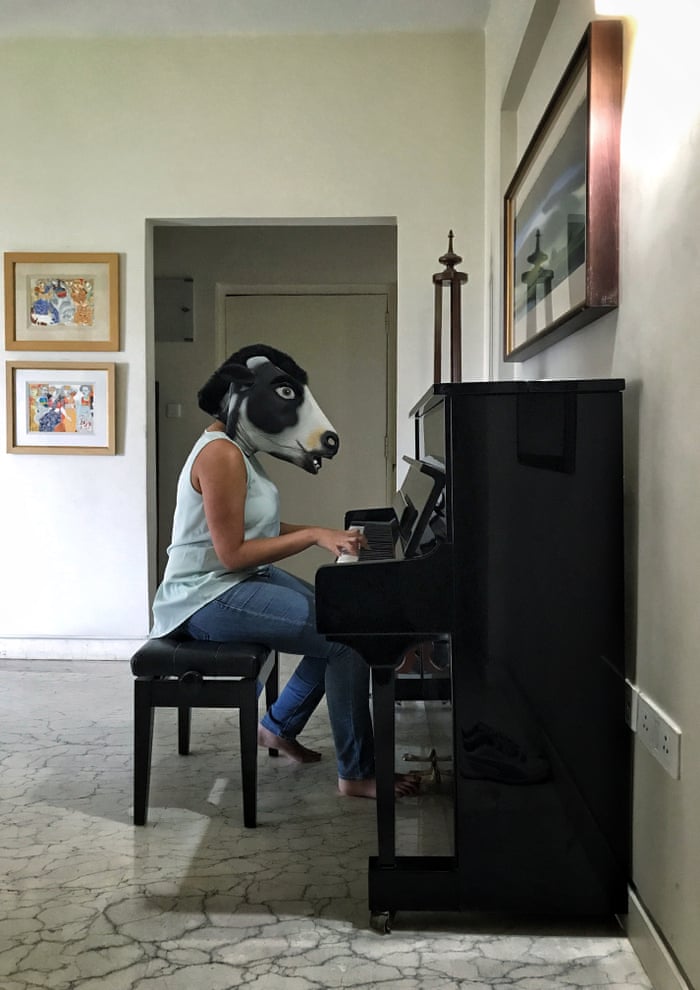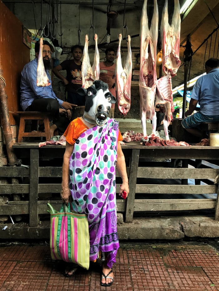 The two trends are juxtaposed in Kolkata artist Sujatro Ghosh’s latest project, which features women wearing cow masks posing outside landmarks, on trains, or lounging about in their homes.