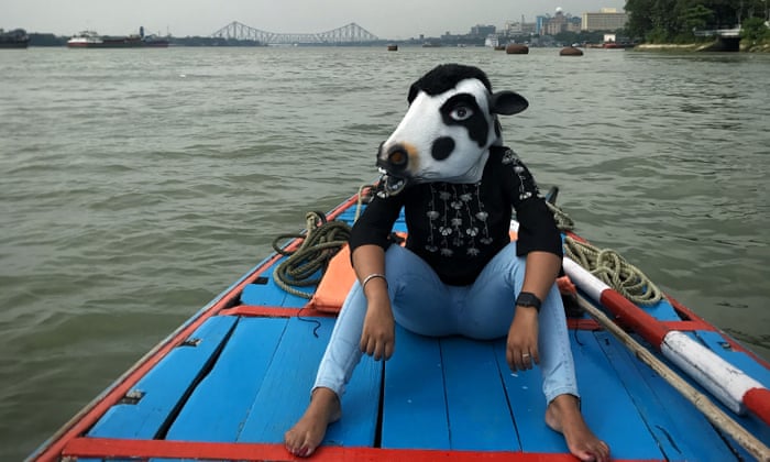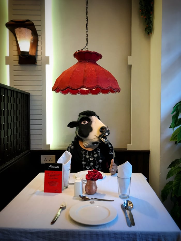 Holy cow: the animal is revered by many in India. Photograph: Sujatro Ghosh--There has been a surge in violence against religious minorities in the name of protecting cows. Photograph: Sujatro Ghosh-- A woman dressed as a cow at a diner. Photograph: Sujatro Ghosh