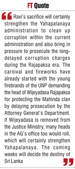 Ravi’s sacrifice will certainly strengthen the Yahapalanaya administration to clean up corruption within the current administration and also bring in pressure to prosecute the long-delayed corruption charges during the Rajapaksa era. The carnival and fireworks have already started with the young firebrands of the UNP demanding the head of Wijeyadasa Rajapaksa for protecting the Mahinda clan by delaying prosecution by the Attorney General’s Department. If Wijeyadasa is removed from the Justice Ministry, many heads in the AG’s office too would roll, which will certainly strengthen Yahapalanaya. The coming weeks will decide the destiny of Sri Lanka.