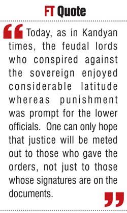 Today, as in Kandyan times, the feudal lords who conspired against the sovereign enjoyed considerable latitude whereas punishment was prompt for the lower officials. One can only hope that justice will be meted out to those who gave the orders, not just to those whose signatures are on the documents.