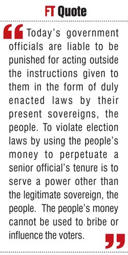 To violate election laws by using the people’s money to perpetuate a senior official’s tenure is to serve a power other than the legitimate sovereign, the people. The people’s money cannot be used to bribe or influence the voters. Such acts amount to treason, according to Kandyan law.
