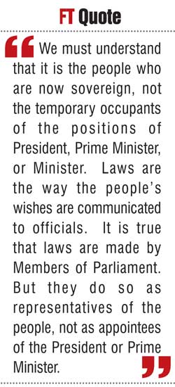 What government officials must understandEven if our mindset is that of the Kandyan era, we must understand that it is the people who are now sovereign, not the temporary occupants of the positions of President, Prime Minister or Minister. Laws are the way the people’s wishes are communicated to officials. It is true that laws are made by Members of Parliament. But they do so as representatives of the people, not as appointees of the President or Prime Minister.