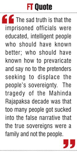 The sad truth is that the imprisoned officials were educated, intelligent people who should have known better; who should have known how to prevaricate and say no to the pretenders seeking to displace the people’s sovereignty. The tragedy of the Mahinda Rajapaksa decade was that too many people got sucked into the false narrative that the true sovereigns were a family and not the people.