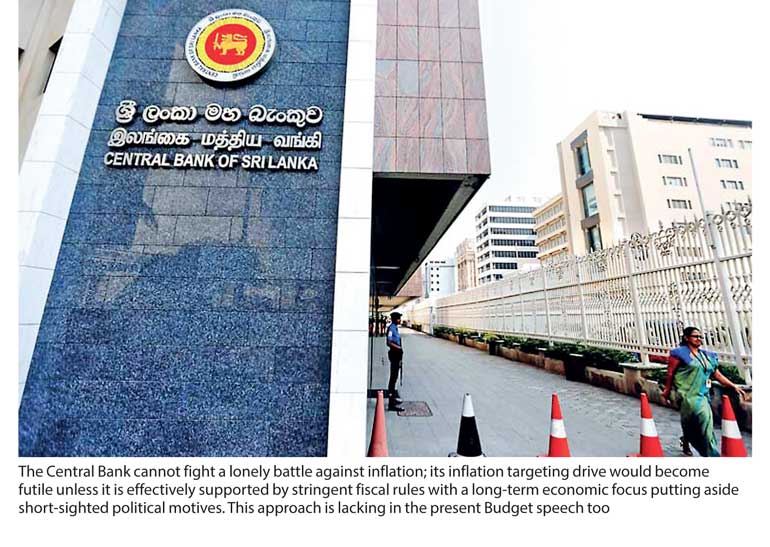 It would be a suicide mission for the Central Bank to undertake inflation target-based monetary policy without strictly enforcing budget discipline by the Government, as I cautioned in my article appeared in the Daily FT of 30 October (see http://www.ft.lk/columns/The-political-economy-of-central-banking-in-Sri-Lanka/4-642422). Although I anticipated it would spark a heated debate, several writers have expressed similar sentiments favouring my argument in their subsequent newspaper articles.