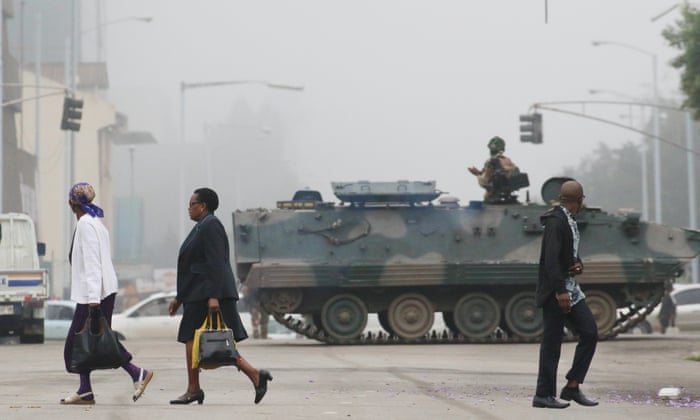 People walk past an armoured vehicle in Harare, one of the vehicles cordoning off Zimbabwe’s presidential seat of power and parliament building after the military takeover. Photograph: Xinhua/Rex/Shutterstock