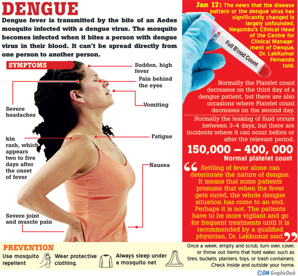 “Settling of fever alone can deteriorate the nature of dengue. It means that some patients presume that when the fever gets cured, the whole dengue situation has come to an end. Perhaps it is not. The patients have to be more vigilant and go for frequent treatments until it is recommended by a qualified physician,” Dr. Lakkumar said. (Sheain Fernandopulle)