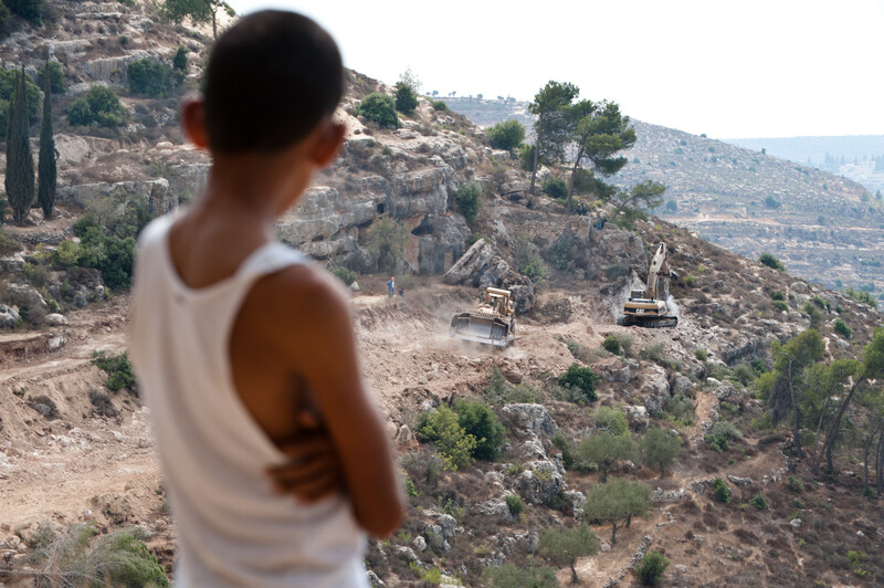 A Palestinian boy watches a bulldozer clearing land for Israel’s wall surrounding the West Bank village of al-Walaja, September 2011.ActiveStills