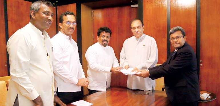 Speaker Karu Jayasuriya and Parliament Secretary General Dhammika Dasanayake receiving the 20th Amendment from JVP Leader and Chief Opposition Whip Anura Kumara Dissanayake yesterday