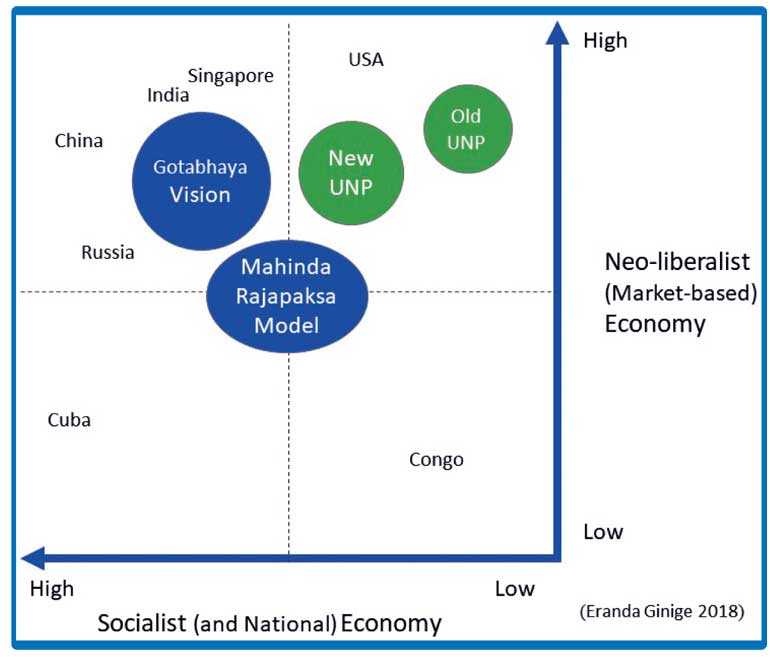 This is why the UNP’s 2025 economic model and Viyathmaga 2030 economic model look similar on the first glance. Both sides are near the centre but leaning to either side. That subtle but hugely important difference must be understood by the citizens (although I used a linear example for ease of explanation, the more appropriate analysis should be made using the below matrix).