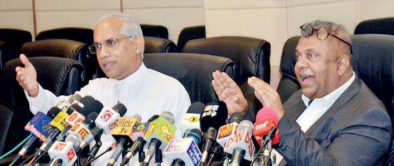 A chorus? Finance Minister Mangala Samaraweera and State Finance Minister Eran Wickramaratne simultaneously gesture at the media briefing yesterday - Pic by Upul Abayasekara