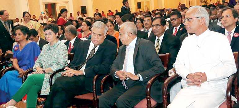 Prime Minister Ranil Wickremesinghe talks to Development Strategies and International Trade Minister Malik Samarawickrama at the launch of the National Export Strategy last month. Others from left are Export Development Board Chairperson Indira Malwatte, Geneva based International Trade Centre Executive Director Arancha Gonzalez and State Minister of Finance Eran Wickramaratne