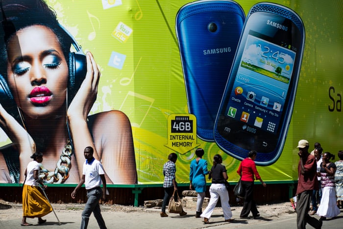 Pedestrians pass beneath a giant mobile phone advertisement in Nairobi, Kenya. Photograph: Bloomberg/Bloomberg via Getty ImagesSo where else does he see signs of success?