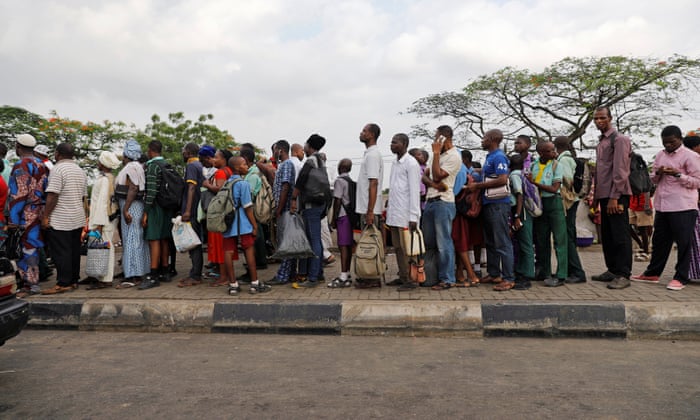 People in Lagos queue at a bus stop. Despite growth, Nigeria now has more people in extreme poverty than India. Photograph: Akintunde Akinleye/ReutersPeter Beaumontin Port Louis and Tom Gardner in Addis Ababa-