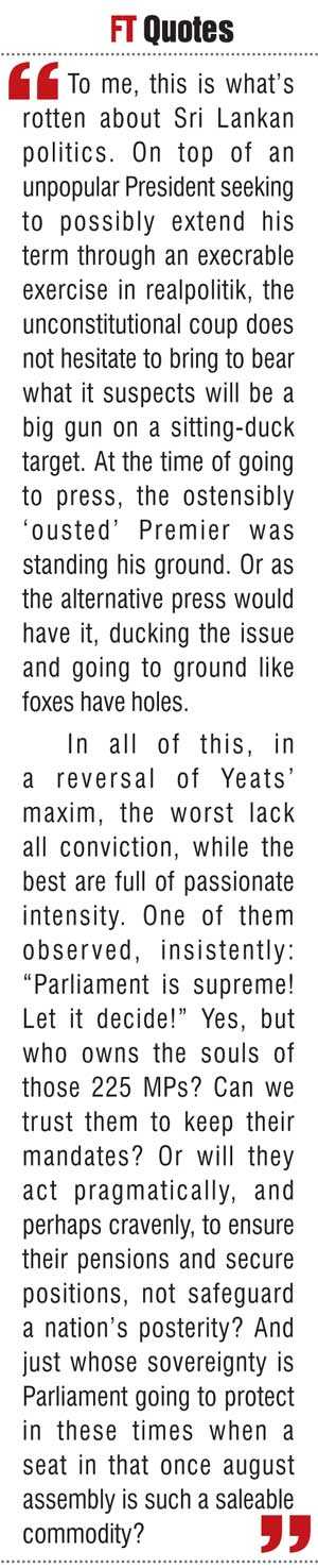 To me, this is what’s rotten about Sri Lankan politics. On top of an unpopular President seeking to possibly extend his term through an execrable exercise in realpolitik, the unconstitutional coup does not hesitate to bring to bear what it suspects will be a big gun on a sitting-duck target. At the time of going to press, the ostensibly ‘ousted’ Premier was standing his ground. Or as the alternative press would have it, ducking the issue and going to ground like foxes have holes.